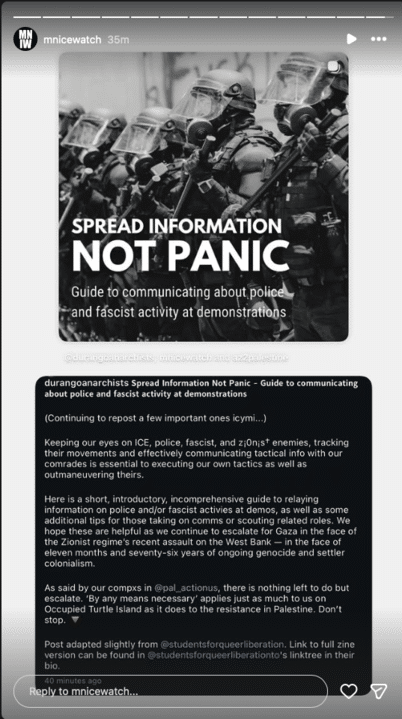 MN ICE Watch, which describes itself as an “autonomous collective documenting & resisting against ICE, police, & all colonial militarized regimes,” shared an Instagram post on Wednesday teaching agitators how to relay “information on police and/or fascist” activity at demonstrations.