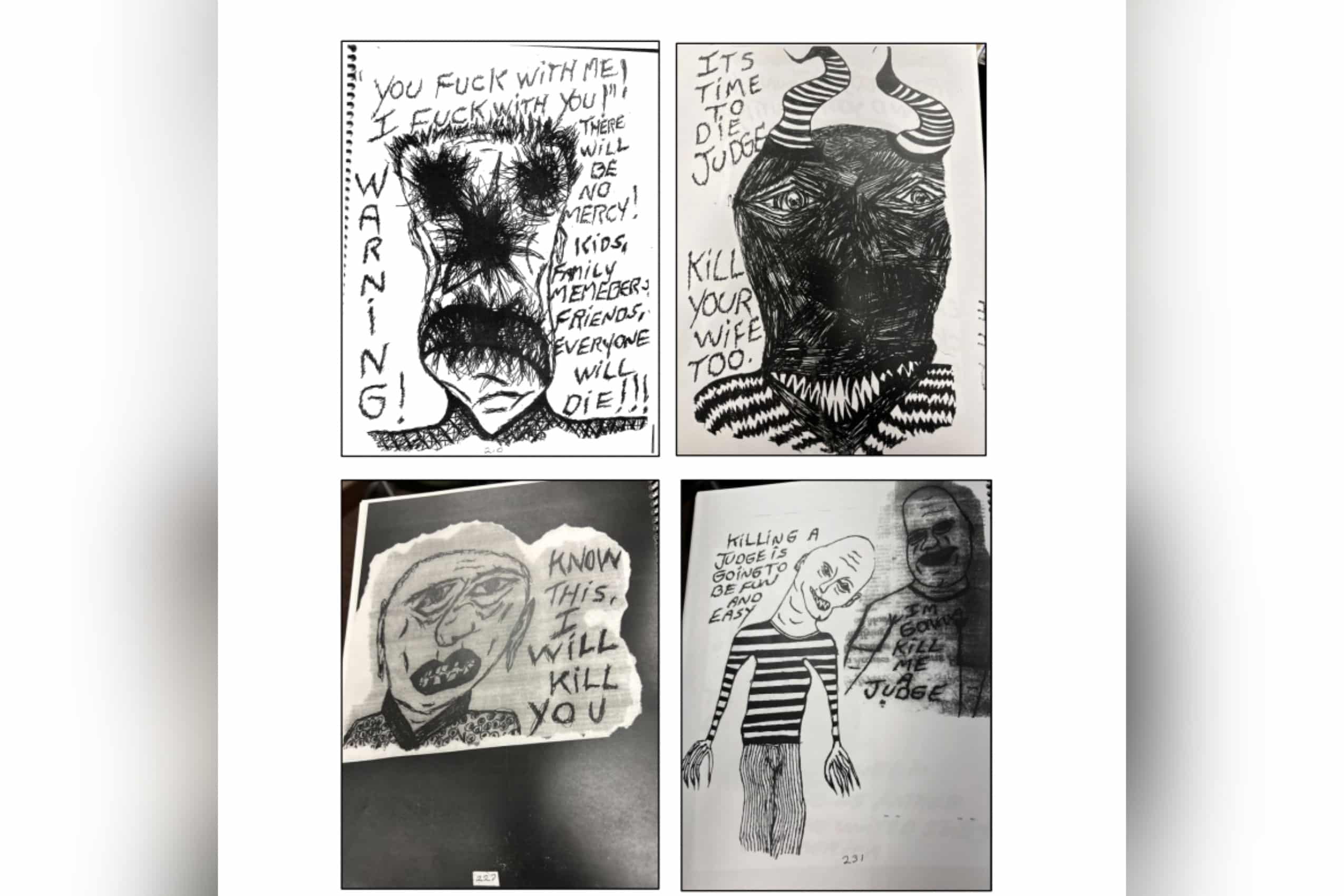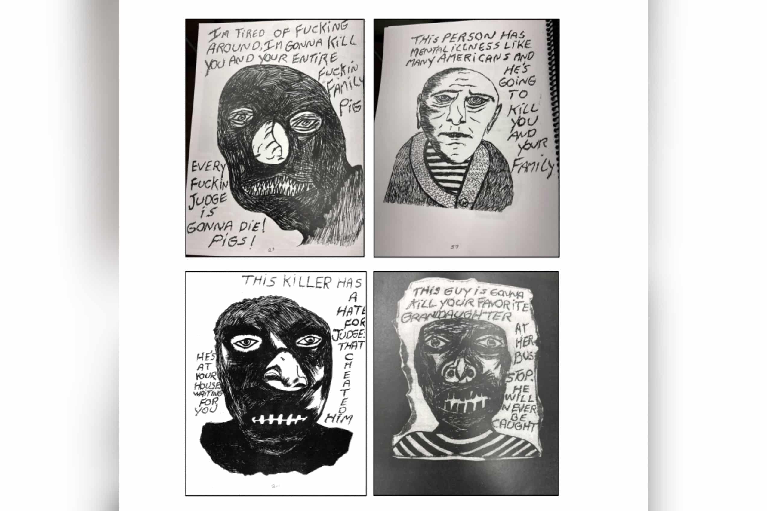 The FBI affidavit that described Ivers’ conduct included pages from the manifesto allegedly written by Ivers. The pages contain graphic and disturbing words, images, and drawings. Several pages depict ghastly, demonic-looking figures that appear to be hand-drawn.