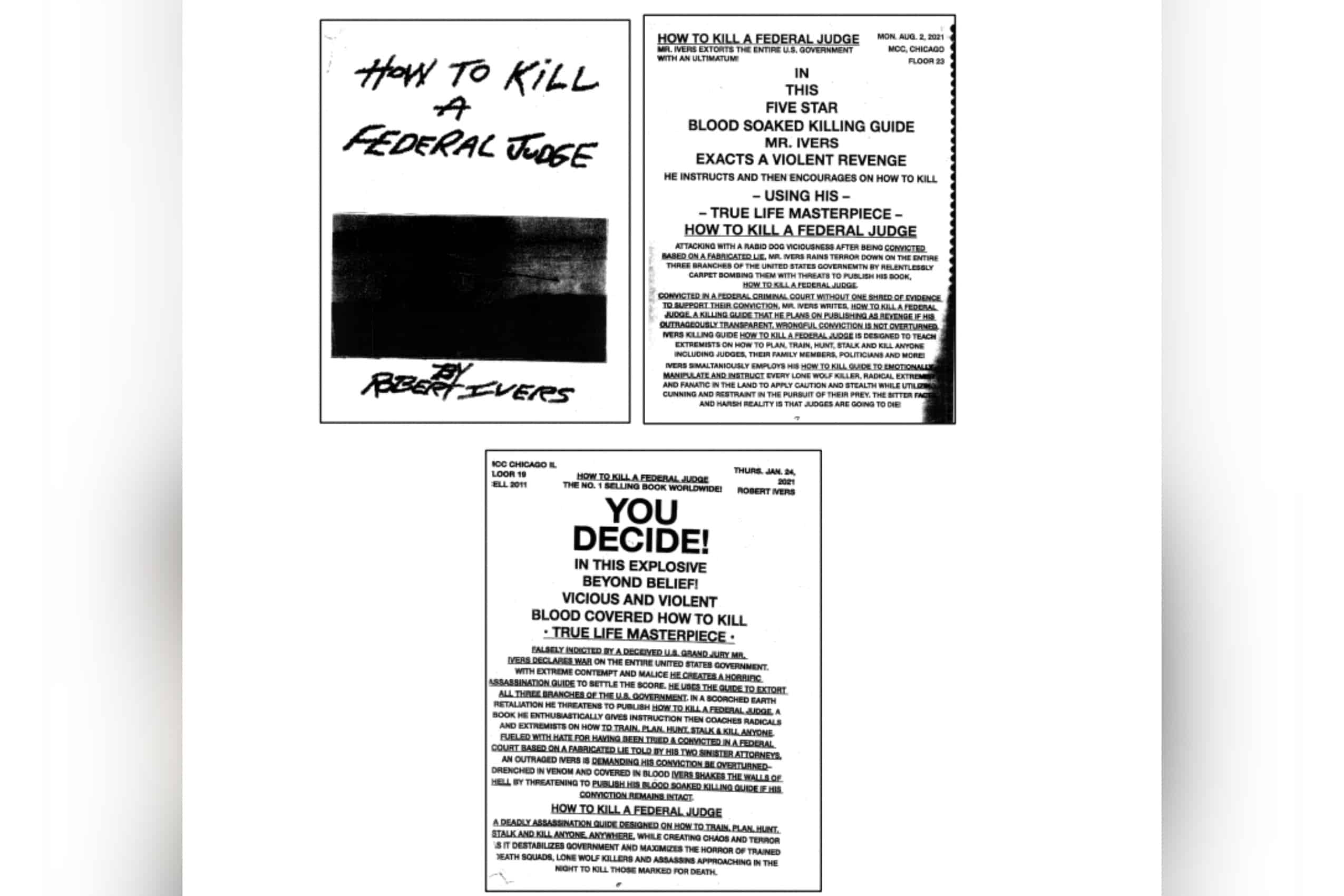 “In this five star blood soaked killing guide Mr. Ivers exacts a violent revenge,” says the document. “He instructs and then encourages on how to kill using his true life masterpiece How to Kill a Federal Judge.”