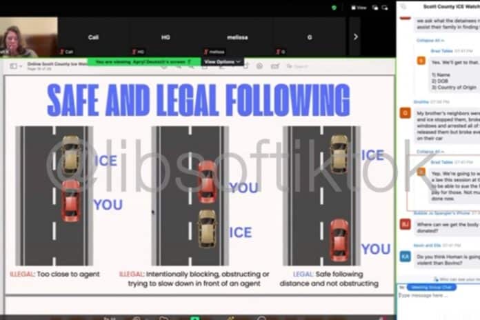 “You have the legal right to follow ICE agents. You cannot obstruct,” a slide from the Zoom training reads. Another slide in the training includes specific instructions on how to properly follow ICE agents. The training also directs participants not to open their vehicle doors or windows if approached by an ICE agent.