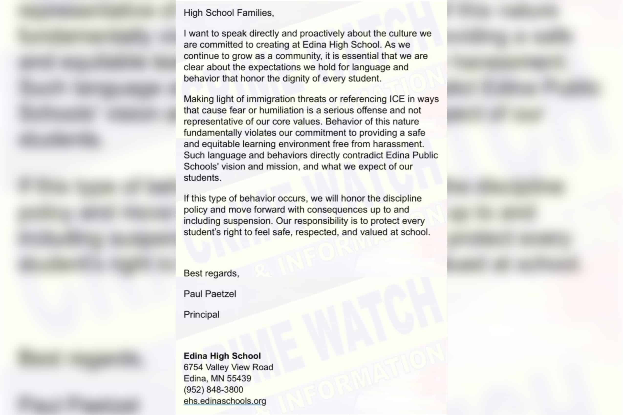 The principal of Edina High School warned in a recent email to families that students who are caught “making light of immigration threats or referencing ICE in ways that cause fear or humiliation” could face suspension.