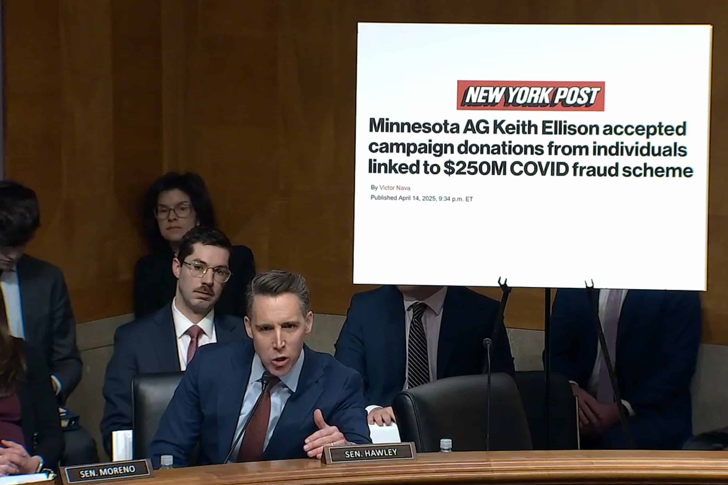 Sen. Josh Hawley, R-Mo., pressed Ellison over his past interactions with individuals connected to the Feeding Our Future scandal, accusing him of enabling what federal prosecutors have described as one of the largest COVID-era fraud schemes in the country.