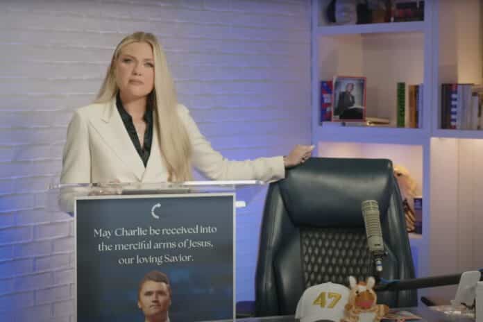 She spoke for just under 18 minutes from the studio where Kirk conducted his weekday podcast, in front of a podium with a picture of Charlie Kirk which said above it, “May Charlie be received into the merciful arms of our loving savior.”