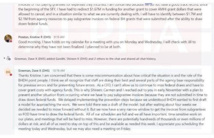 His message, which appeared to place blame on the agency’s behavioral health division, also said, “As a CFO, I can’t allow us to continue to miss federal draws and have to cover grant costs with agency funds.”
