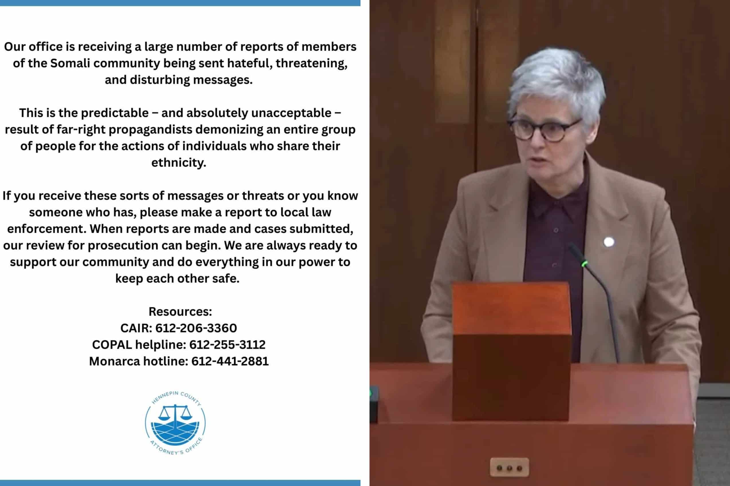 Amid national attention on fraud in Minnesota, Hennepin County Attorney Mary Moriarty has warned that people who send “hateful” messages to the Somali community could face prosecution.