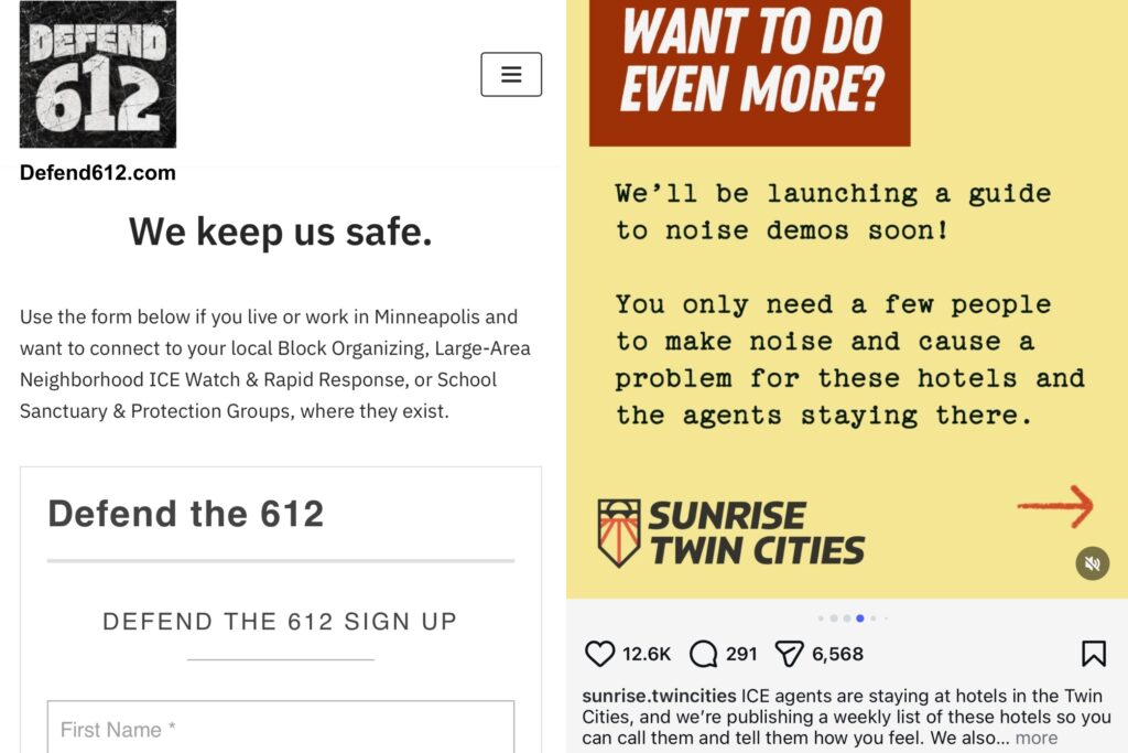 Groups listed in the letter include MN ICE Watch and Defend the 612, which organizes block-by-block ICE Watch teams, school “sanctuary” initiatives and rapid-response patrols. Other groups like Sunrise Twin Cities are publishing lists of the hotels where ICE agents are staying.
