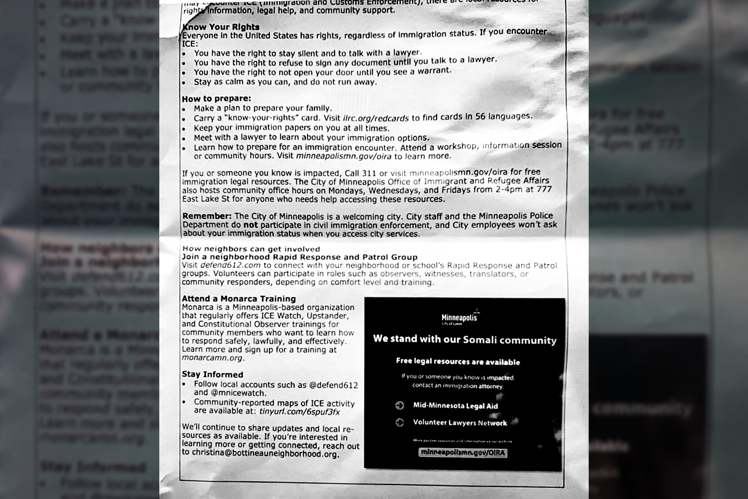 As for the letters, they appear to come from the Minneapolis Office of Immigrant and Refugee Affairs, and direct people to activist networks, training events and rapid-response patrols designed to monitor and respond to federal immigration enforcement. The letter urges residents to carry “know-your-rights” cards and warns people not to flee from an ICE officer, stating, “do not run away.”