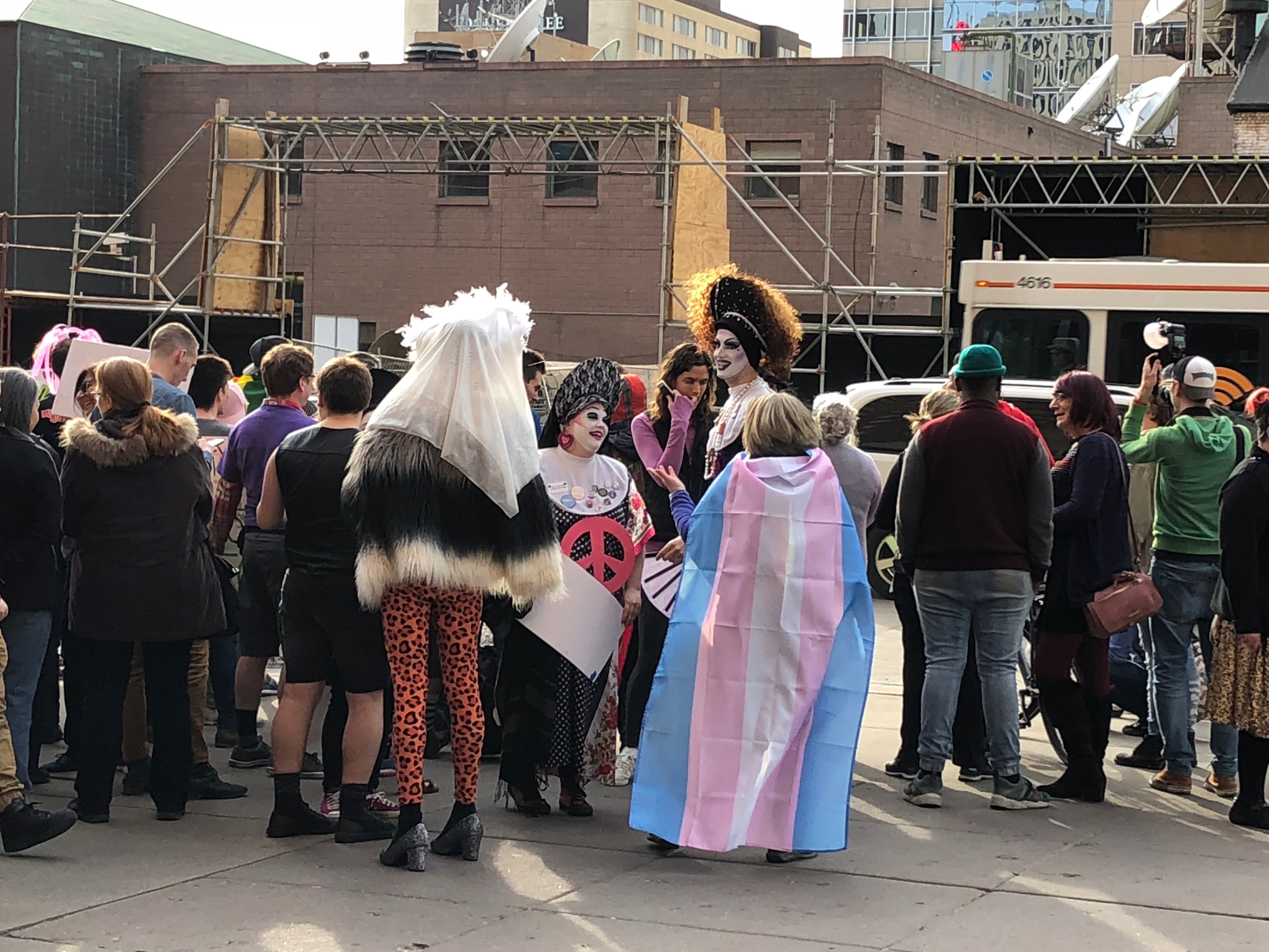“We’re protesting Tim Pawlenty being the keynote speaker at a Minnesota Family Council gala dinner because they’re a group that spews hate towards gay people and transgender people and believes it’s not real, based on some science that doesn’t exist,” said a protester dressed with a trans flag as a cape.