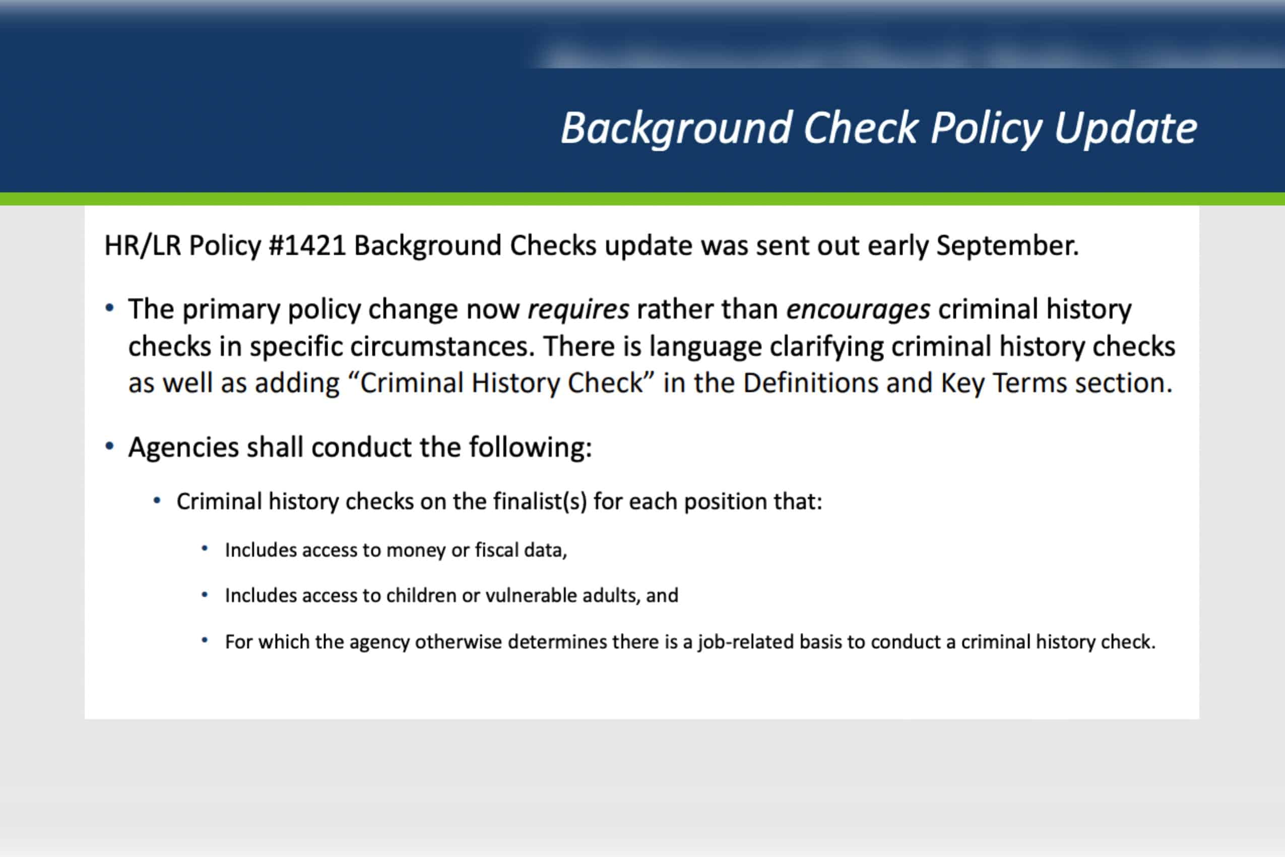Under the new rules, agencies will conduct criminal history checks on finalists for each position that “includes access to money or fiscal data, includes access to children or vulnerable adults, and for which the agency otherwise determines there is a job-related basis to conduct a criminal history check.”