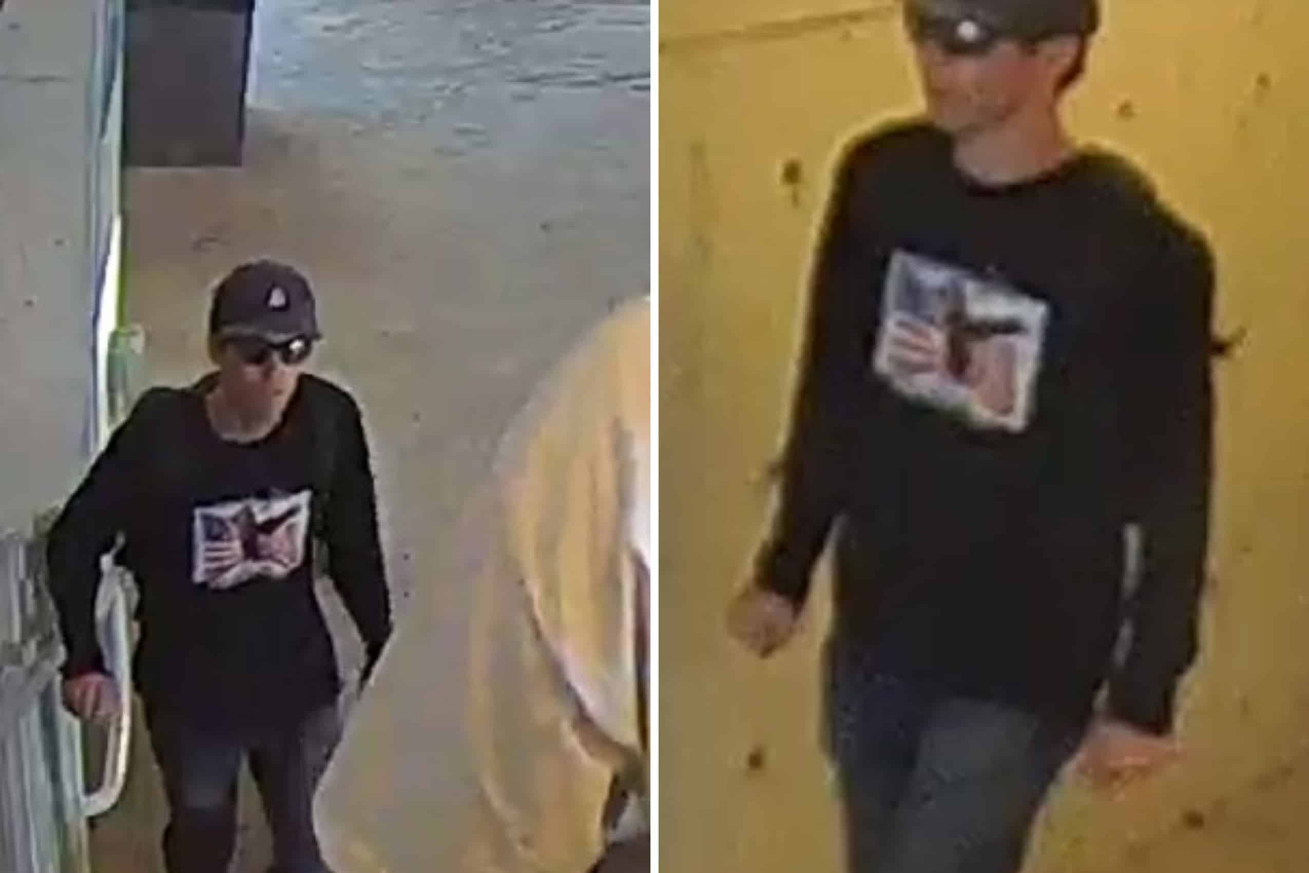 Authorities released photos showing a slender man in jeans, a long-sleeved black shirt with an American flag design, dark sunglasses, and a hat.