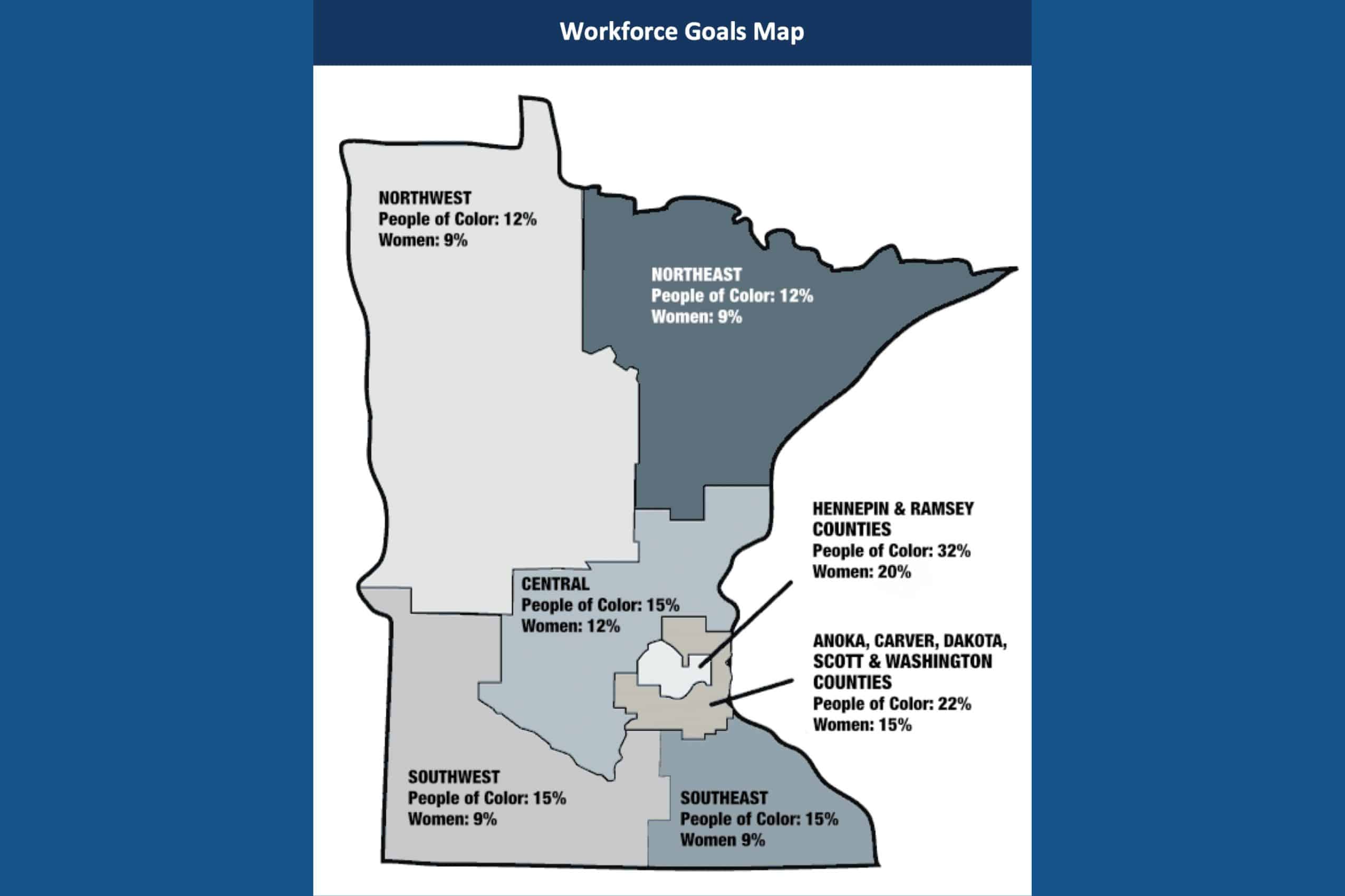 Those workforce goals vary by location. For example, if a project is in Hennepin or Ramsey counties, then MDHR wants 32% of all project work hours to be performed by “people of color,” and 20% of all project work hours performed by women.
