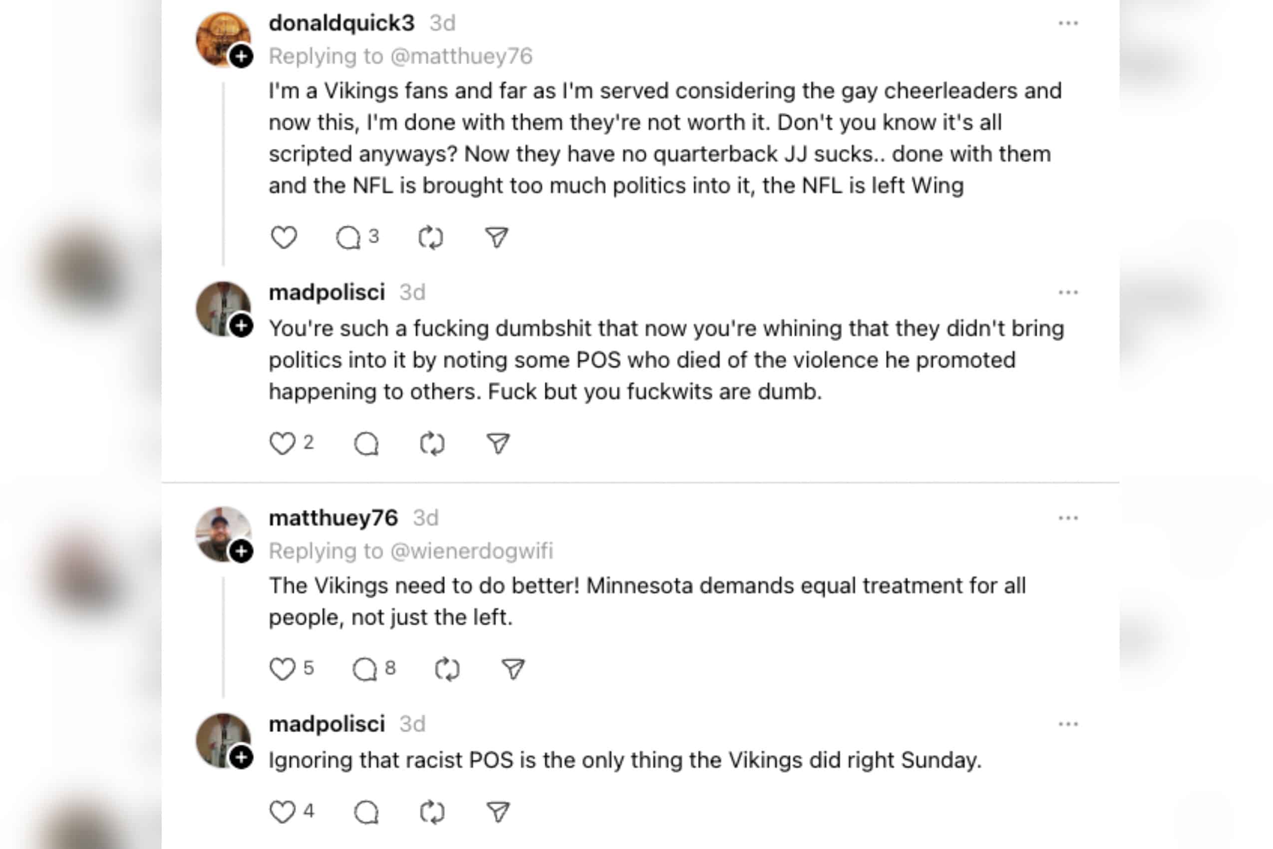 In a social media exchange, political science professor Kevin Parsneau referred to Kirk as a “POS who died of the violence he promoted happening to others.” Parsneau also replied to a post about Kirk and the Minnesota Vikings, saying, “Ignoring that racist POS is the only thing the Vikings did right Sunday.”