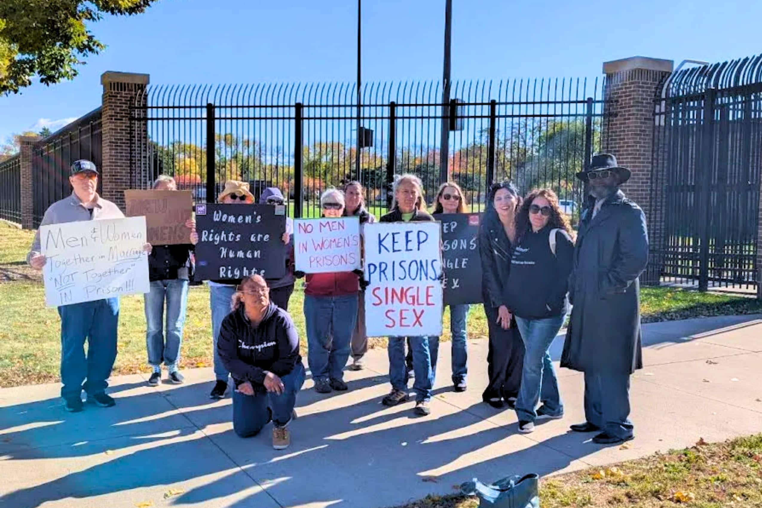 Ali fished around in her bag for some pieces of paper: “I came up with some other mantras.” We tried another chant but couldn’t get the rhythm right, and went back to Hey hey, hey ho, all these men have got to go. For a while we went with the call and answer: Show me what democracy looks like! This is what democracy looks like! We walked along the outside of the fence and chanted and held our signs. More people had joined the group, making it about 14 in all, when a local KSTP TV station photographer came over. Ali said she had notified some media about the protest, and I too contacted KSTP, Alpha News (though that’s where I found out about the protest), Fox 9 News, MPR (just to force them to make the editorial decision to pretend this atrocity is not happening), the Star Tribune, and a couple special notes to Congresswoman Betty McCollum and Governor Tim Walz to say the only reason they are still warming their respective chairs after voting to torture female prisoners over and over again is because very few Minnesotans know, or could even conceive of it happening. And as always, I wrote, the truth would out.