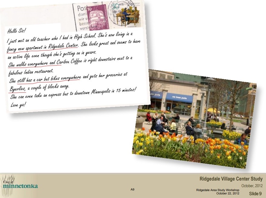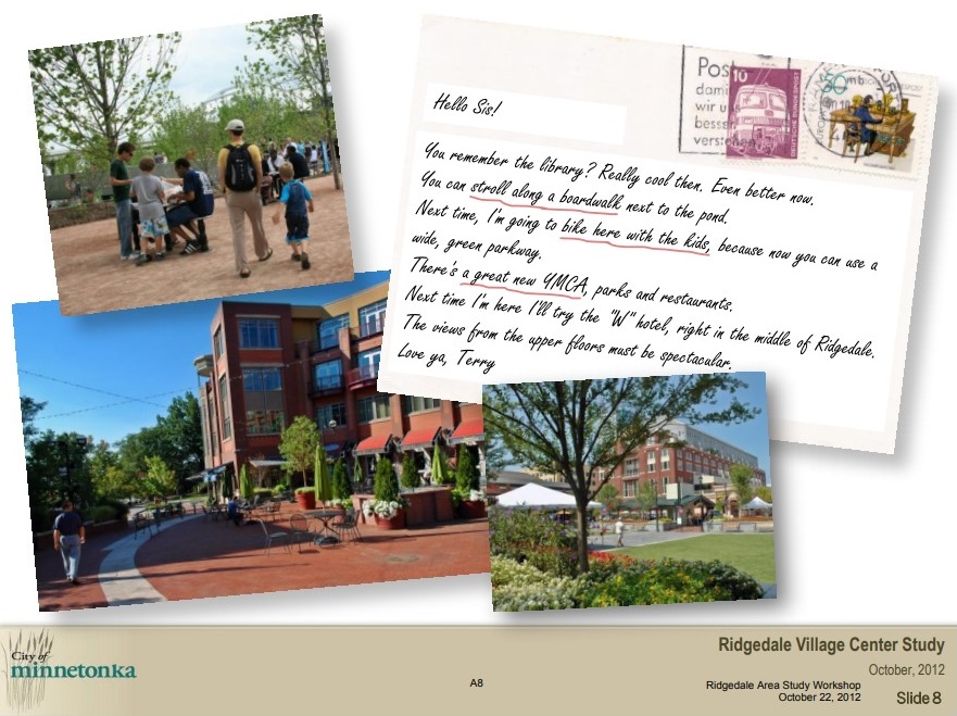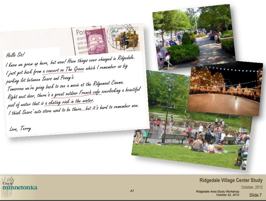 In 2012, the City of Minnetonka began work on a “master plan” to guide future developments in the Ridgedale area as well as control land use, design, and “key investments.” The plans, which are laid out in two PowerPoint presentations “Ridgedale: A vision for 2035” and “Ridgedale Area Public Realm Guidelines,” aim to promote social change by turning the area into an urban hotspot.