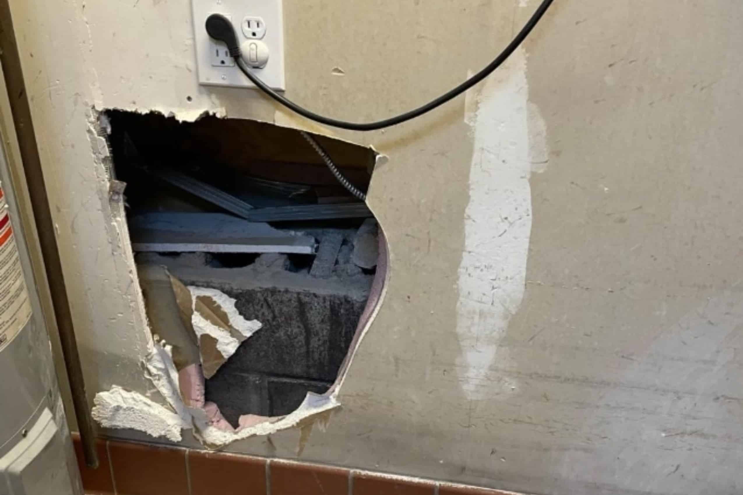 The video and other photos posted online showed a hole in the drywall, where the manager claimed a burglar broke through the cinder block wall to get inside the daycare. The video also showed the manager leading a Tusmo Times reporter to the outside of the building, where the break-in reportedly occurred behind the fencing of a dumpster bay. The video showed a pile of apparent cinder blocks piled up in the dumpster bay and the wall covered with a piece of plywood.