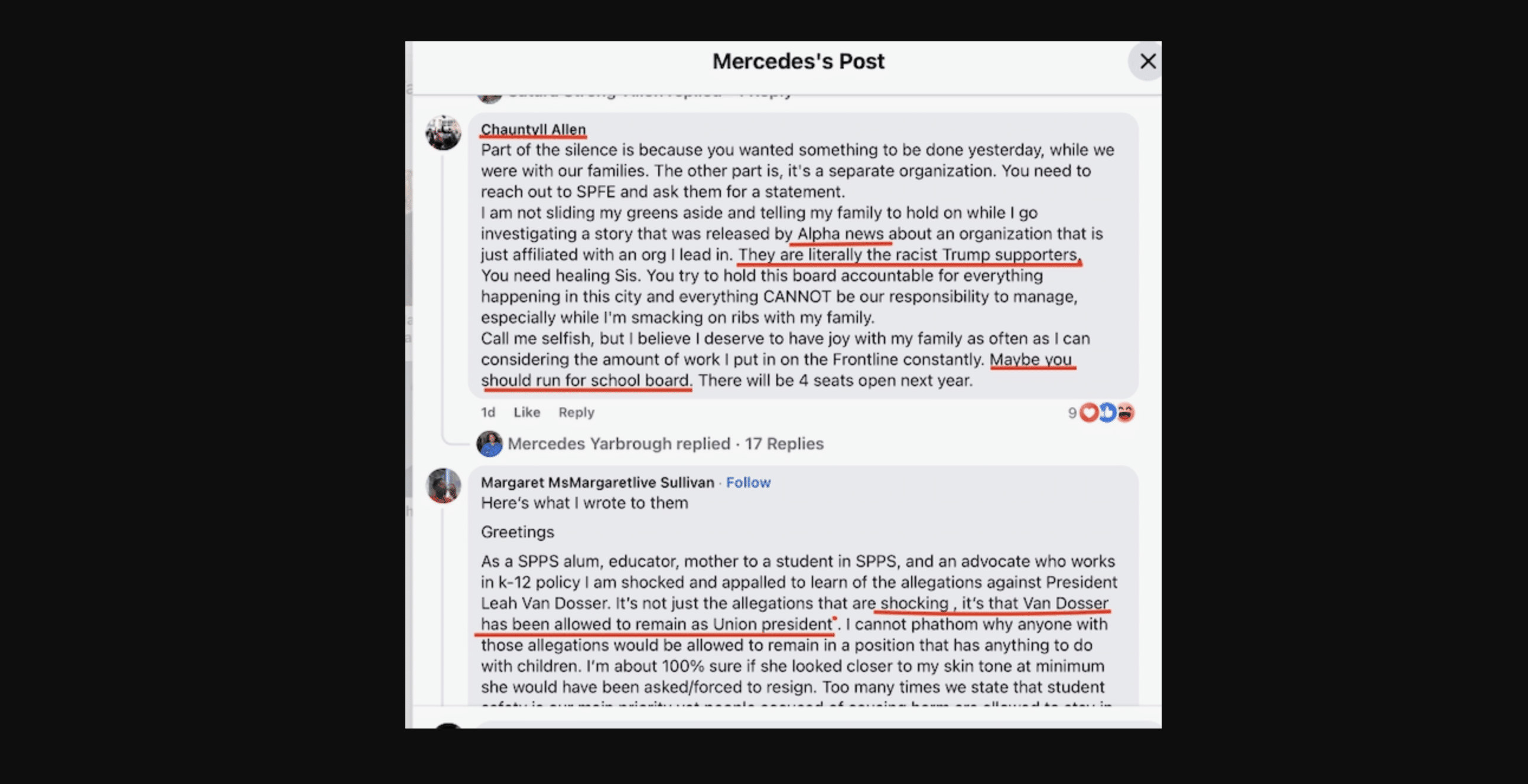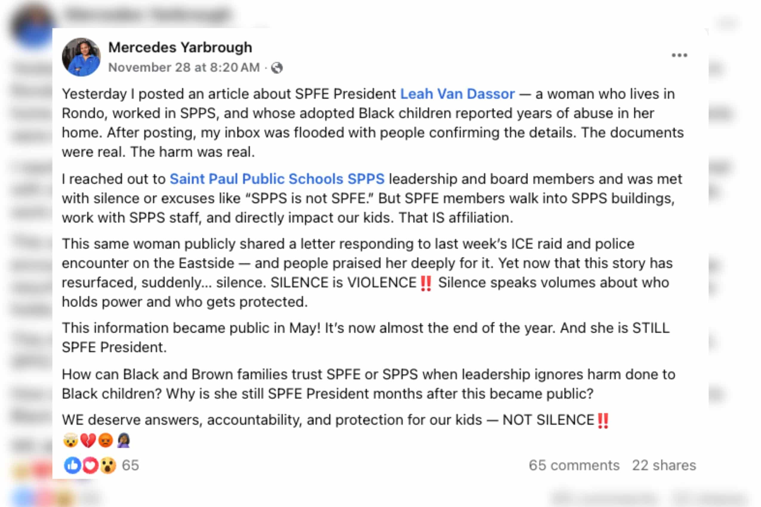 On Facebook, St. Paul Public Schools (SPPS) advocate and educator Mercedes Yarbrough wrote in a Nov. 28 post that her inbox was “flooded” after she reposted Alpha News’ reporting on VanDassor the day before.