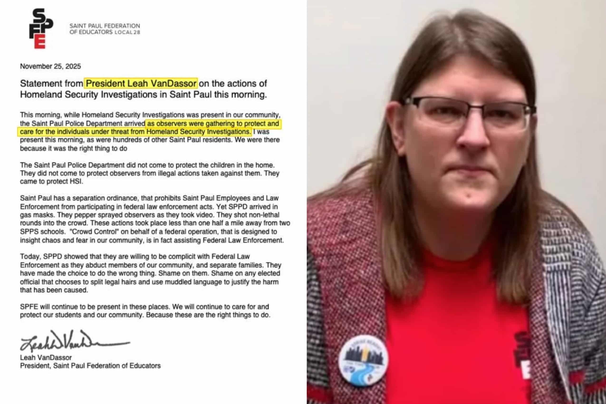 In a November 25 letter, Leah VanDassor, president of the Saint Paul Federation of Educators (SPFE), condemned last week’s Homeland Security Investigations (HSI) operation and accused the St. Paul Police Department of being complicit in “separating families” and causing “harm.”